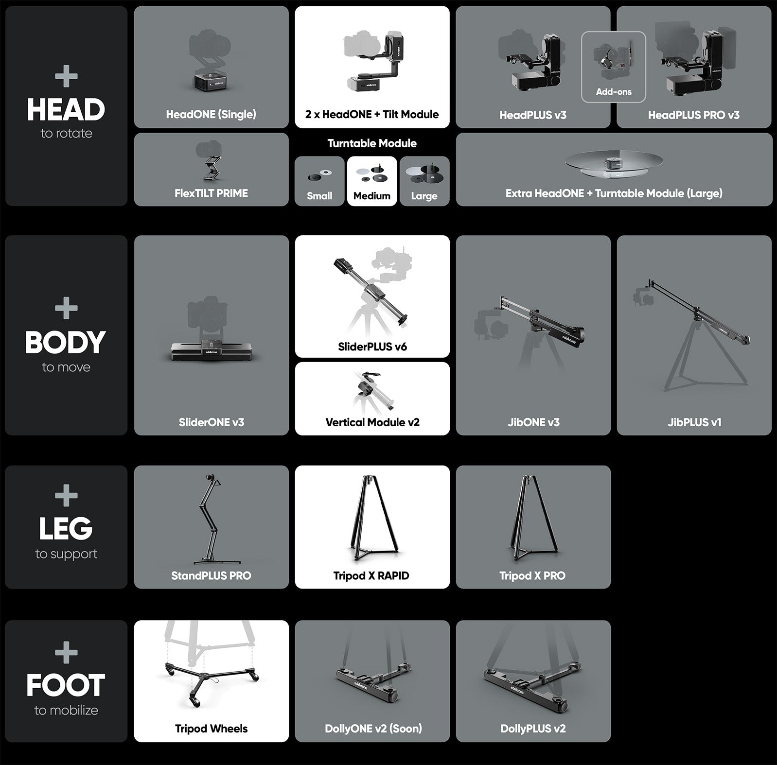 Centered around the all-new SliderPLUS v6 with a built-in motor, extended motion range, and seamless vertical operation via the Vertical Module, this bundle delivers unmatched versatility. It features the medium Turntable Module for HeadONE, enabling synchronized 360° rotation of products. An additional HeadONE included in the system allows for precise Point Tracking, whether in a dual-HeadONE setup for panning and tilting, or a single-tilt setup that locks perfectly onto the rotating product. All motion—slide, pan, tilt, and rotation—is effortlessly orchestrated through a single app.